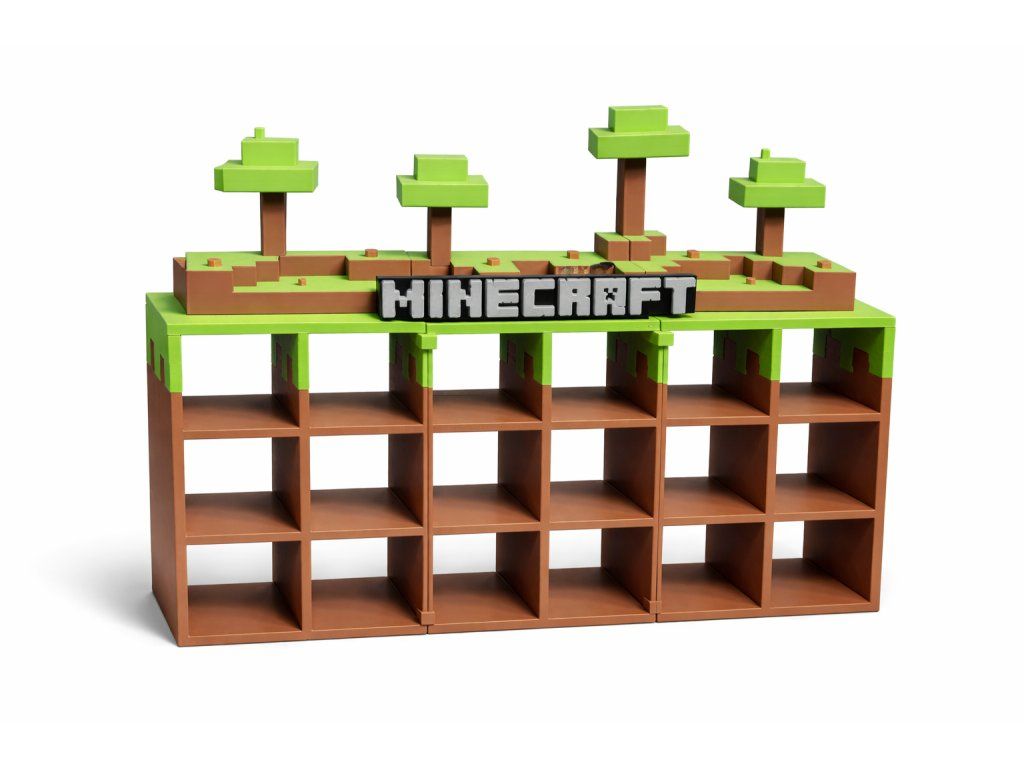 Horní část s typickou minecraftovou krajinou dodává poličce jedinečný vzhled, takže se stane nejen praktickým organizérem, ale také originální dekorací do dětského pokoje, herního koutku nebo sběratelské vitríny.